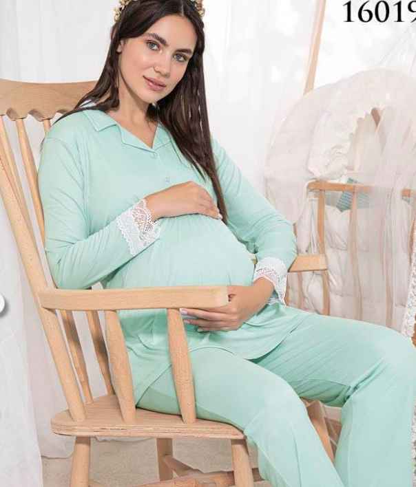 Ensemble 2 pièces pour futures mamans à porter pendant et après la grossesse: Haut manches longues avec des boutons et dentelles au niveau de l’épaule. Pantalon taille élastique qui s’adapte bien à votre tour de taille.